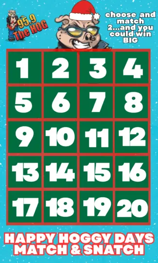 - The 959 The Hog Money Match Game Promotion will begin at approximately 3:00 PM EST on 12-01-25 and end on 11:59 PM EST on 12-12-25.